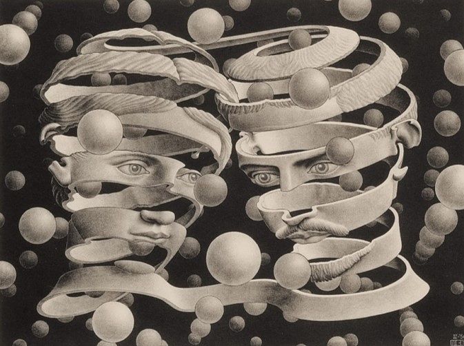 The “Bond of Union” art-work by M. C. Escher in 1956, where two heads, one of a man and one of a woman, are structured in the most representative chiral shape, the helix.